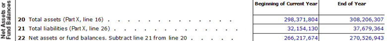 The Inspirational Network reported $308 million in total assets on page one of its 2022 Form 990, shown in the screenshot below.