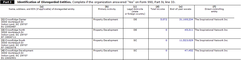 Therefore, if there were a consolidated financial statement of The Inspirational Network, it would report total assets of the non-profit ministry, its holding company and property development companies to be at least $1,136,000,000.
