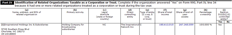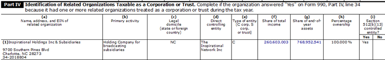 Buried deep in the 990 under Schedule R is a fascinating disclosure. Inspirational Holdings Inc. & Subsidiaries, which is owned by The Inspirational Network, had $786 million in assets at the end of 2022.