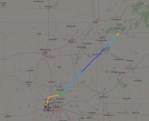 (Screenshot: On July 27th, preacher Keith Moore traveled on his ministry’s Raytheon 390 jet from Branson, Missouri, to Fort Worth.)