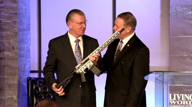 * This article features a correction. It originally incorrectly reported that Living Word Church in Midland, Michigan, gifted Pastor Mark Barclay a gold-plated AR-15. Instead, Living Word Christian Church in LaCrosse, Wisconsin, was responsible for the gun gift.
