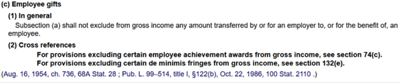 Small gifts such as snacks and a T-shirt provided occasionally at work are considered de minimis, and not subject to taxation.