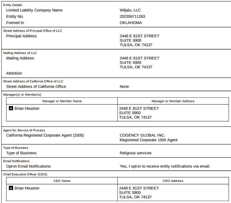 In 2023, Winters & King, a law firm in Tulsa, Oklahoma, specializing in religious non-profit legal issues, filed paperwork with the states of California and Oklahoma creating the limited liability company Wiljalo, LLC. The following screenshot reports the type of business for Wiljalo, LLC is religious services.