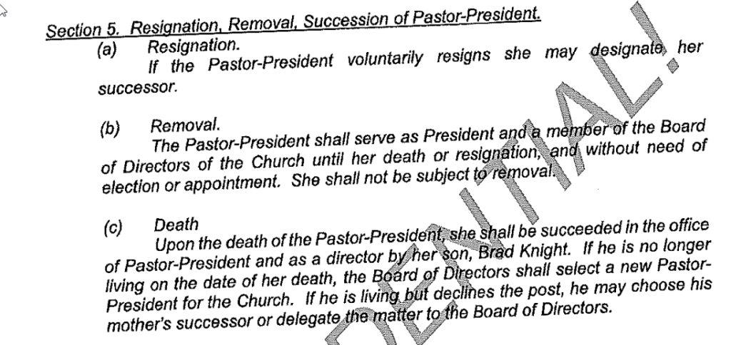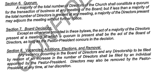 The old bylaws for New Destiny Christian Center revealed that Paula operates the church as a spiritual dictator. Paula cannot be removed from the church leadership: “The Pastor-President shall serve as President and a member of the Board of Directors of the Church until her death or resignation, and without the need of election or appointment. She shall not be subject to removal.”