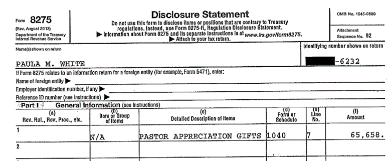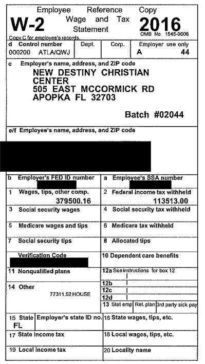 Clergy housing allowances are reported to the IRS on the W-2 Form as “other.” In 2016, Paula White received a $77,311.52 housing allowance from New Destiny Christian Center.