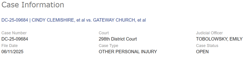 On September 17th, Judge Amos Mazzant denied Gateway Church’s motion to have the case dismissed. The plaintiffs are planning to submit an amended complaint to the court in October.