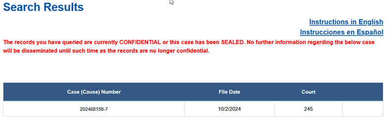 Visitors to the Harris County Clerk of Court receive notice that the case is confidential when searching by case number 202468158.