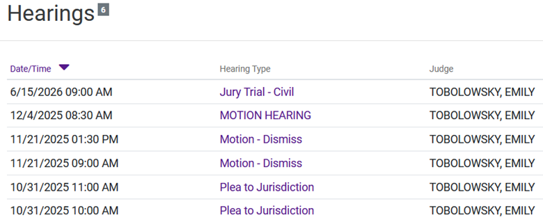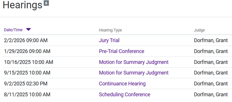 The defendants have filed motions to have the case dismissed. On November 21st and December 4th court hearings are scheduled which will determine the outcome of the motions to dismiss, as shown in the following Screenshot.