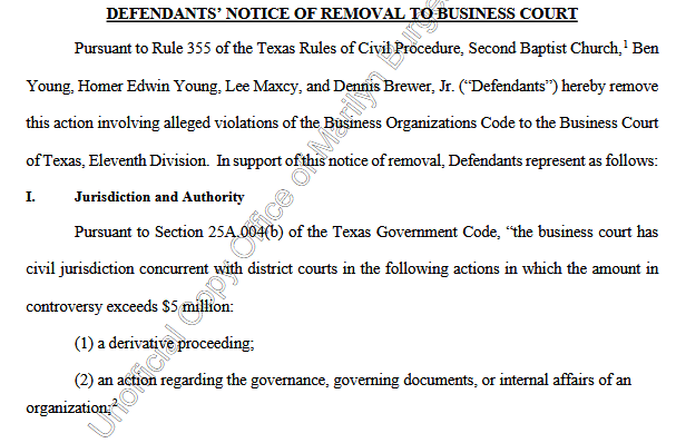 Attorneys for the church challenged the original jurisdiction, filing a notice the case would be moved to the Texas Business Court, Eleventh Division.