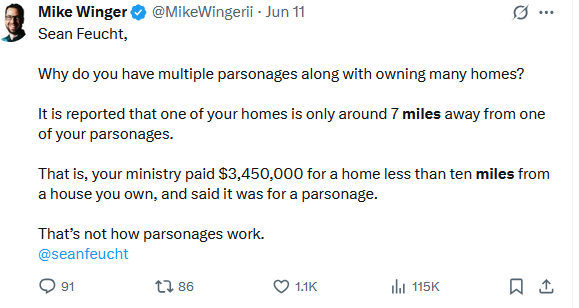 Sean Feucht Ministries has acquired three parsonages in California, Montana and Washington, D.C. Meanwhile, Sean Feucht has acquired ten personal properties. Does Feucht receive housing allowances in addition to parsonages?