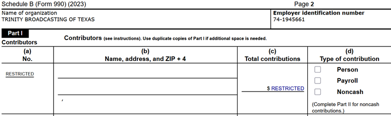 (Screenshot: When a donor gives $5,000 or more to a non-profit organization, the donation is reported on Schedule B of a 990. The donor’s name, address and donation amount are redacted by the IRS before the 990 is published online.)