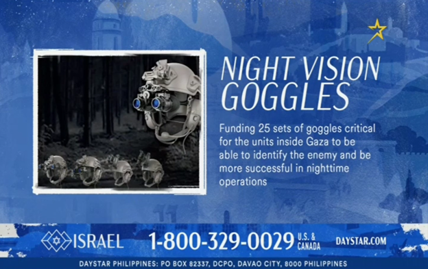 Since October 2023, Daystar’s telethons have raised money to purchase body armor and night goggles for the Israeli military as well as bomb shelters for Jewish civilians.