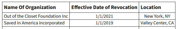The above screenshot features all the public information that is available from the IRS regarding this revocation of tax-exempt status. The IRS does not reveal what illegal activity it uncovered during an audit or investigation.