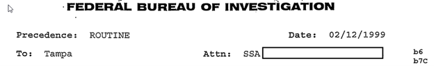 The following photo comes from a document obtained from the FBI after submitting a FOIA request. The Supervisory Special Agent’s name is withheld. The codes appearing in the right margin indicate why information is redacted.