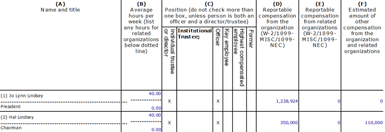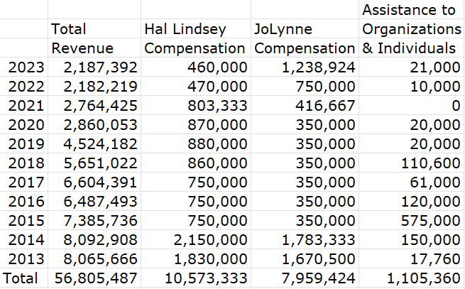 From 2013 to 2023, Hal and his wife JoLynne Lindsey received $18.5 million of compensation from Hal Lindsey Website Ministries. During those eleven years, the ministry spent only $1,105,360 in charitable assistance to groups and individuals.