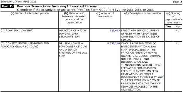IRS instructions for Schedule R require non-profit organizations to list brother/sister organizations which the IRS defines, “An organization controlled by the same person or persons that control the filing organization.” Jay Sekulow is CEO of both ACLJ and CASE; Gary Sekulow is CFO of both non-profits.