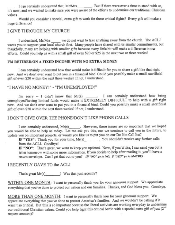 Telemarketers were given a script, leaked to Trinity Foundation and the press, explaining how to respond when the callee was hesitant or refused to donate. Unemployed callees were to be told, “Could you possibly make a small sacrificial gift of even $20 within the next three weeks?”