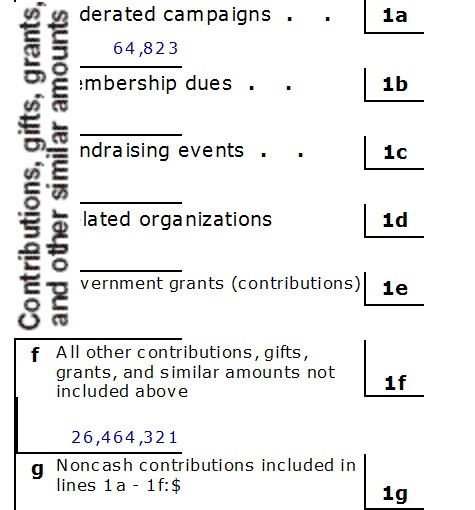 ACLJ does not treat CASE as a related organization (line 1d is left blank on the 990 Statement of Revenue page as shown in the following screenshot). Instead, the money appears to be included with “contributions, gifts, grants.” Because the fiscal year for ACLJ ends on March 31st while CASE’s fiscal year ends on December 31st, the cash grant amount does not match.