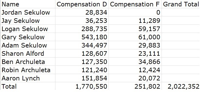 However, CASE, which operates with a different fiscal year, ending December 31st, reports at least $36,253 in compensation for Jay Sekulow for 2022, as shown in the screenshot below.