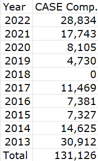 According to CASE’s 2022 Form 990, the non-profit has 13 employees and spent $3,020,582 on salaries, compensation and employee benefits. Part VII Section A reports the compensation of only nine employees, which is re-created in the following spreadsheet.