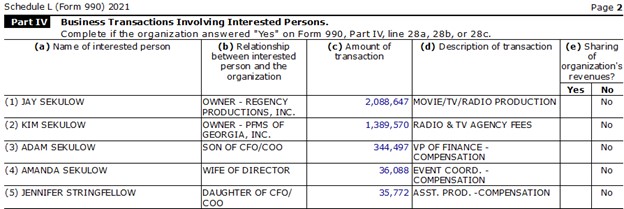 It is also unknown how much Jay Sekulow and Kim Sekulow receive in compensation from Regency Productions and PFMS of Georgia.