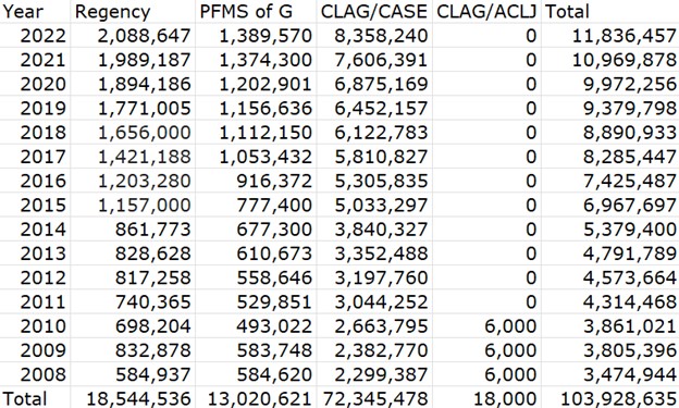ACLJ has paid CLAG more than $72 million since 2008, as shown in the spreadsheet below. By comparison, CASE paid CLAG a miniscule $18,000 during this time period.
