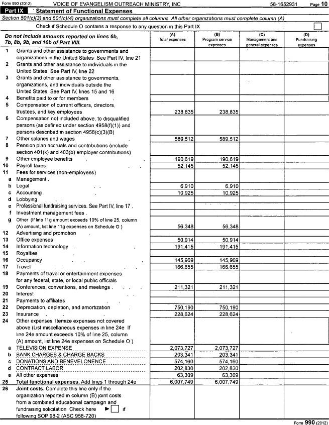 In 2013, the Voice of Evangelism filed its last Form 990, disclosing to the IRS and the public how it spent donor funds. At the end of the 2012 fiscal year, the ministry had total assets of $41,657,794. That year the ministry reported total revenue of $17,832,658 and total expenses of $6,007,749.