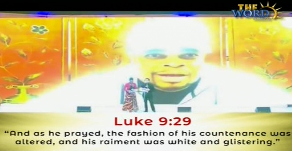 One televised cartoonish image shows a larger-than-life apparition of Taylor’s head and shoulders with a golden face, dressed in white, shining clothing, behind two miniature people on stage as if he is a giant spirit appearing to them. A banner across the bottom of the screen quotes the scripture about Jesus’ physical appearance on the mount of transfiguration, “And as he prayed, the fashion of his countenance was altered, and his raiment was white and glistering.” (Luke 9:29) Again, nothing subtle about the glorified imagery.