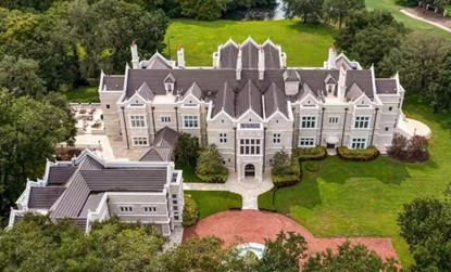 … private gated entrance welcomes you … premier private gated country club … Perfectly positioned for the ultimate in privacy and exclusivity, on just under 6 manicured acres, overlooking a golf course, pond, conservation area. … impeccable … detail inside and out, …a main house, guesthouse, 10 bedrooms, 10 full baths, 3 half baths and boasting (over 28,800) masterfully crafted square feet (including a 2,620 SF Guesthouse). Meticulous design elements include a grand foyer entry, ballroom, executive library, 14 fireplaces, wine room, elevator, numerous terraces … 5+ car garage. An inviting gourmet kitchen … top-of-the-line stainless appliances, generous center island and breakfast area. … gracious living area/media room, along with an opulent bath. …grandeur … outdoors … an inviting pool and spa, … with a cabana and fireplace, marvelous limestone terrace area … entertaining pavilion with outdoor kitchen. … One of Tampa Bay’s most exclusive… blah blah blah, here’s a photo…