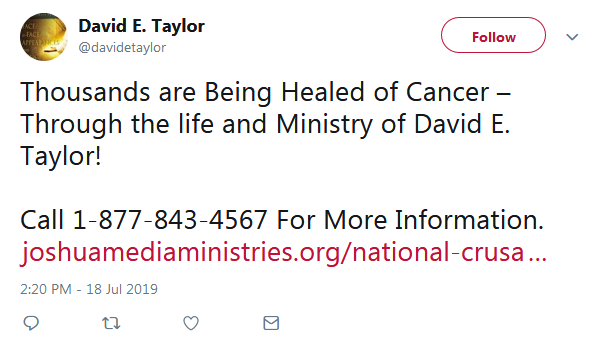 “Faith healer” David E. Taylor posted this on Twitter on July 18, 2019.