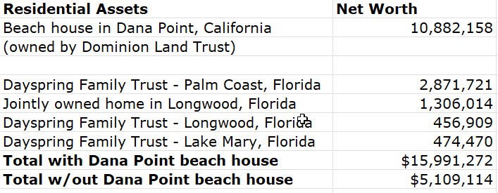 There are unanswered questions regarding the ownership of the California beach house. Does Price function as a dummy director for eMinistries Consulting and Dominion Land Trust? Does Price have a partial ownership stake or is it entirely owned by Benny?